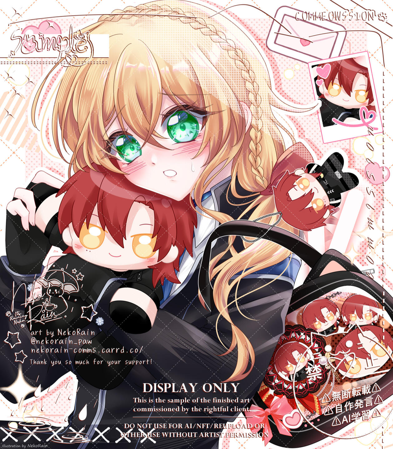 DO NOT USE FOR AI OR NFT. It's prohibited to use any of my arts including commissioned artworks for AI in any kind. This includes "Grok", "Sora AI", "Chat GPT" and any other AI tools. It's NOT allowed to use any of my artwork for AI training, AI enhance, or any kind of AI use.