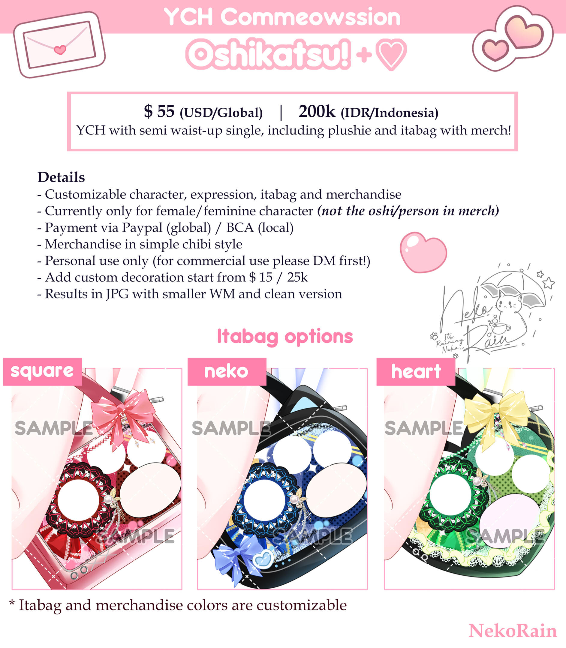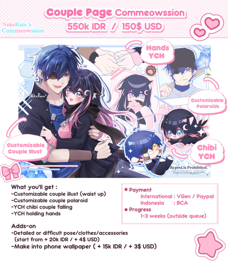 Commercial Use : Commercial use will add the price more depending the usage of the arts. Stream assets/promotional usage; 2x price. Physical merchandise; 3x price. But please talk it to me first before commissioning for commercial use!